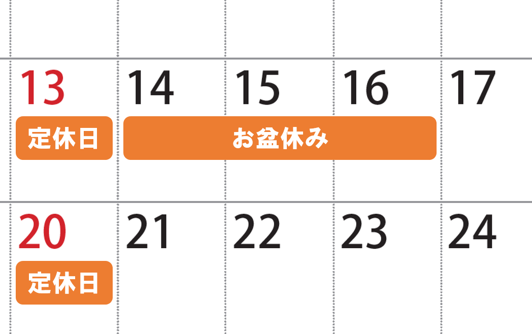 8月13日(日)~16日(水)はお盆休みのため休業いたします。
